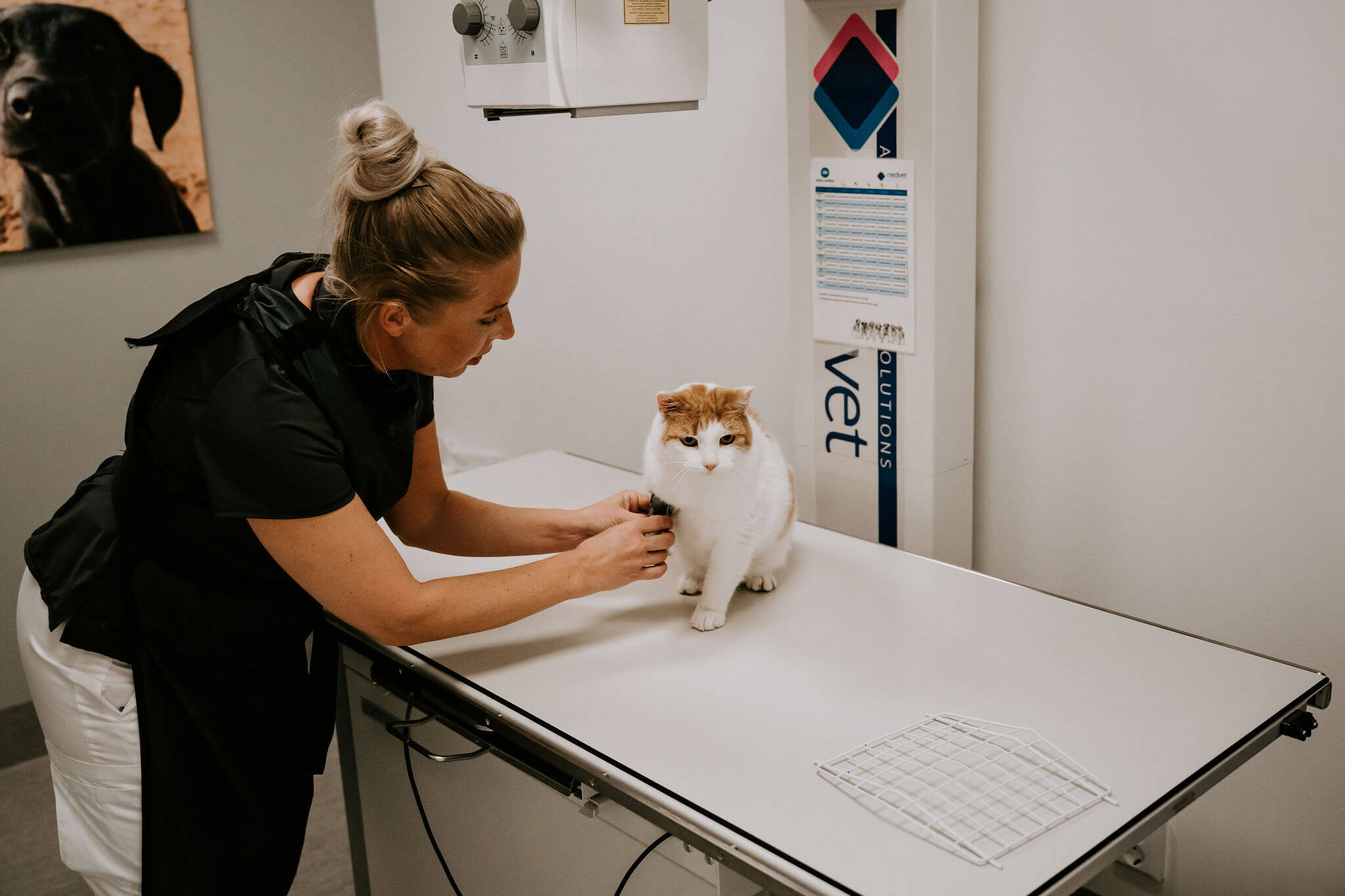 Röntgenundersökningar är smärtfria, men kräver att djuret ligger stilla på röntgenbordet. Sköterskan och djurägaren hjälps åt vid undersökningen. Om du som djurägare inte vill eller kan delta vid röntgenundersökningen, kan vi utföra det själva. I vissa fall kan djuret behöva lugnande för att kunna utföra röntgen på ett så stressfritt sätt som möjligt.